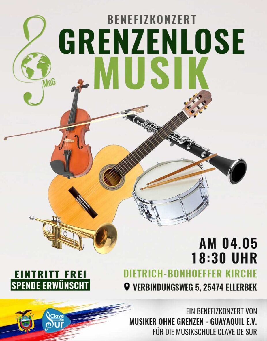 Musiker ohne Grenzen – Guayaquil e.V. lädt ein zum Benefizkonzert für die Musikschule Clave de Sur am 04.05.2024 um 18:30 in der Dietrich-Bonhoeffer-Kirche in Ellerbek bei Hamburg! Freut Euch auf einen Abend voll grenzenloser Musik, verschiedener Musikgenres und Erzählungen aus dem Musikprojekt in Ecuador. Bei dem …